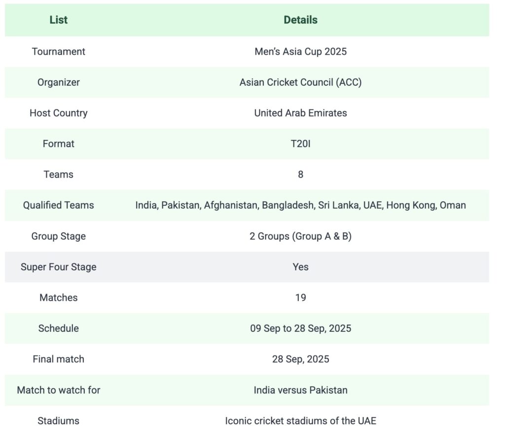 डिस्क्लेमर: इस ब्लॉग में दी गई Asia Cup 2025 से जुड़ी जानकारी केवल सामान्य सूचना के उद्देश्य से है। शेड्यूल, लाइव स्ट्रीमिंग और अन्य विवरण में समय-समय पर बदलाव संभव है। कृपया आधिकारिक स्रोत से जानकारी अवश्य जांचें।