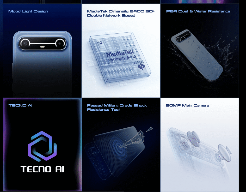 POVA Slim 5G में Dynamic Mood Light भी दी गई है, जो रियर कैमरा के चारों ओर चमकती है और कॉल, नोटिफिकेशन या चार्जिंग के दौरान एक्टिव होती है (Hindustan Times).