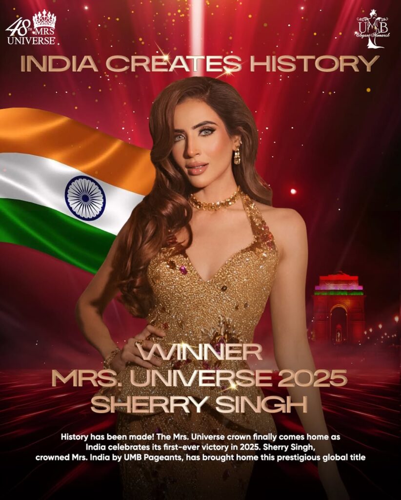 Sherry Singh आज पूरे भारत के लिए गर्व का विषय बन चुकी हैं। उन्होंने हाल ही में Mrs Universe 2025 का ताज जीतकर इतिहास रचा और भारत को यह पहला खिताब दिलाया।Moneycontrol+1